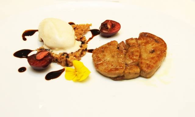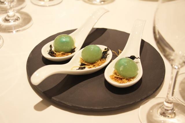 頭盤小點海上明珠,包含魚子醬、扇貝、海膽、糖豌豆、糟鹵,各種材料皆沒改變原本面貌,在碟上配搭起來,視覺上叫人聯想海洋,而味覺上,亦給我新鮮感覺。另一頭盤則表現分子料理精萃,鵝肝竟然配搭梅菜冰琪琳,還加鎮江醋,瘋狂想法,卻味道吻合,我拍案讚好。黑鱈魚配蓮子慕絲、蓮花瓣、蓮藕、梅子、香檳,都是新配搭,刺激味蕾。
