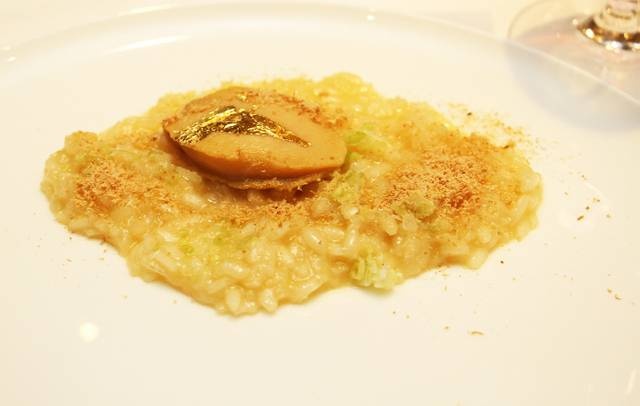 主菜燴鮑魚,我認為最能表現他的烹飪精神。他保持鮑魚形態,卻用上牛油、意大利9年陳年米、黃雞湯來燴。我們嘴嚼此塊鮑魚,跟平常吃到的乾鮑同樣軟腍,但味道卻稍不同,多點新意,擴闊我們味蕾感覺,給我們一點興奮。