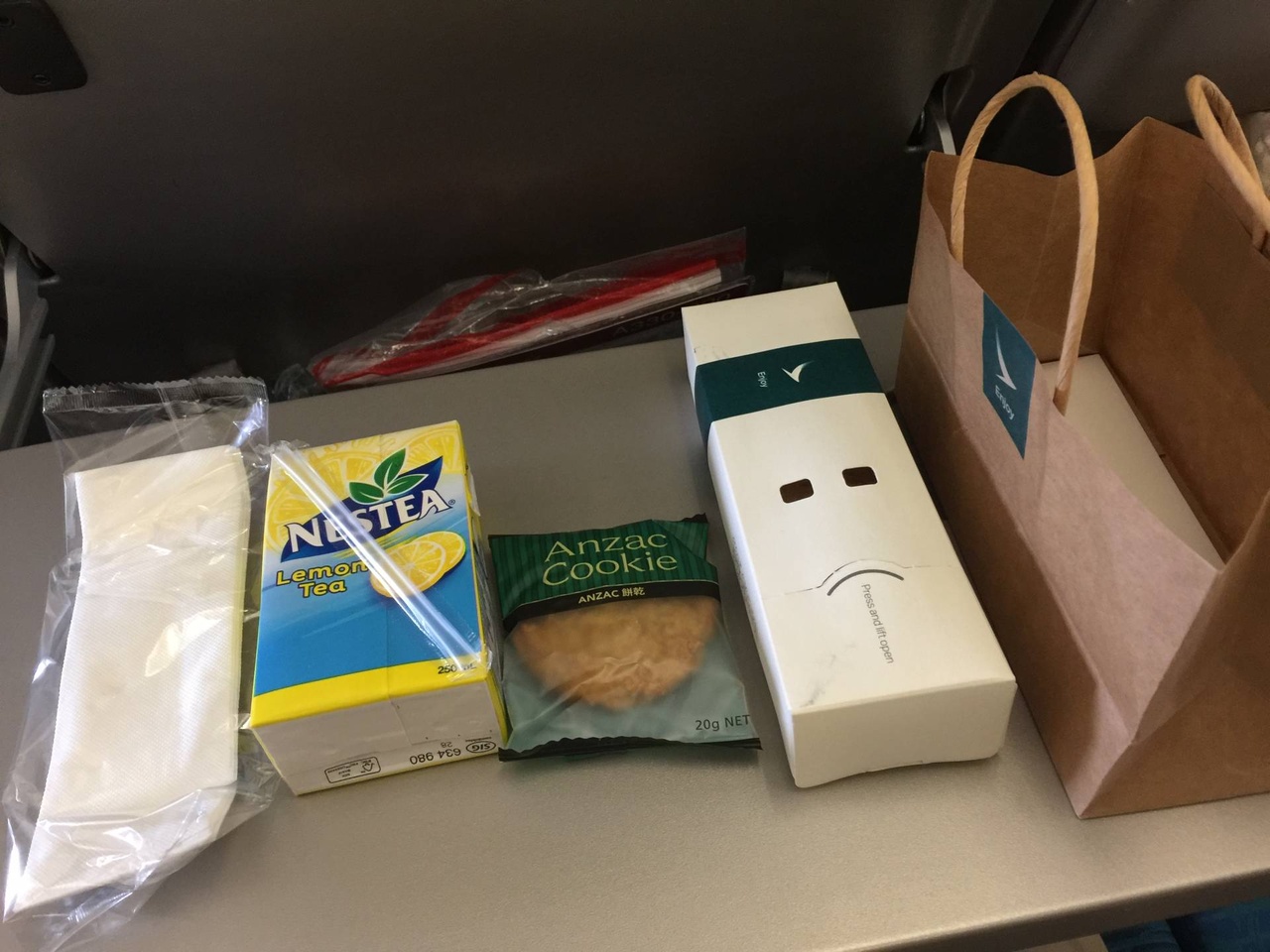 8月時乘國泰航班到台北,經濟客位飛機餐,每人派一個紙袋,內裡包括一張紙巾、一紙盒果汁、一塊曲奇餅、一紙盒熱包,我覺得是大改進。