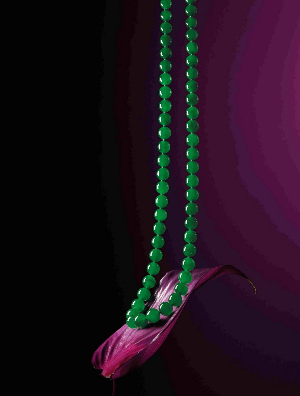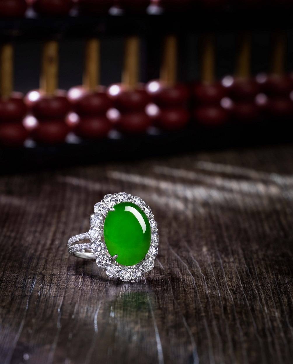達到帝王綠的翡翠首飾都是天價,而往往都會成為拍賣場上的頂級拍品。這些收藏級翡翠極品大致分為五類,圓珠頸鏈、手鐲、蛋面鑲嵌頸鏈或戒指,吊墜,擺件。款式看似簡單,造價卻往往最高,原因就在於其重天然去雕琢的本質,而令其對選料要求極高。試想一下,一串合乎「濃、正、陽、和」的翡翠頸鏈,首先便得在頂級原石中找到最好部分,再要考量珠子大小,在確保其顏色光澤一致均勻和細膩下,才切割打磨以剔除瑕疵。儘管選料貴重而損耗極大,卻絕無拉雜拼湊的餘地。