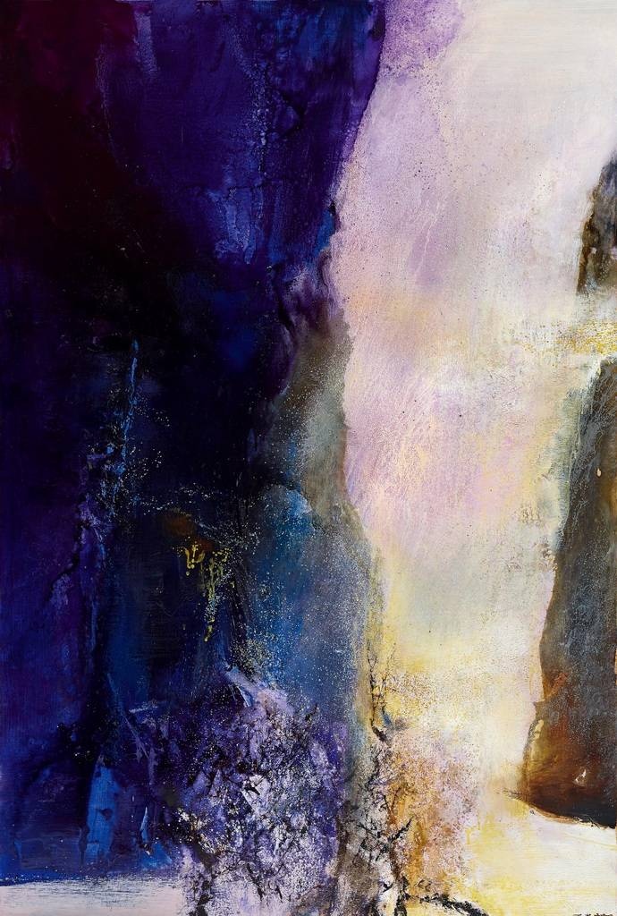 華人抽象大師趙無極,是二十世紀以來最早打入西方核心藝術圈、最被認可的中國藝術家。截至今日,海內外收藏其作的國立藝術機構逾138家,當中包括:巴黎羅浮宮、紐約大都會美術館、北京中國美術館等東西方博物館界巨擘。《25.06.86 桃花源》完成於趙無極國際聲望如日中天的黃金年代。作品採其創作中極為罕見的垂直三澗式構圖,透過比例大小的配置,製造出自然的空間感。在畫布的左半,他奔放地施以亮麗的藍紫色彩,大膽地讓它佔據畫布近乎三分之二的空間。在那大面積的色塊中,懸浮透亮的葡萄紫隨著柔韌綿延、躍動飛揚的墨黑線條由地面蒸蒸上升,和寶藍、靛青與墨色交織、迸溢出如山壁般的形象,層層向上遞嬗,蒼茫勁拔,柔中見剛,當中還有如琉璃灑溢的點點金光,為作品注入一絲溫暖的氣息。